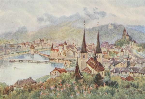 In France I always reckon that a town of less than fifty thousand people is likely to retain untouched its medieval character, or at any rate its atmosphere of the sixteenth or seventeenth century. Exceptions of course occur—I make one in the case of Aix-en-Provence, which seems to have been mostly rebuilt, though in very delightful fashion, as late as the eighteenth century. Mere modern watering-place growths, again, like Biarritz or Vichy, must also be eliminated—they had obviously no character to lose. But apart from towns like these, my general proposition will be acceptable, I think, to anyone who dwells, on the one hand, on places like Beauvais, or Cambrai, or Chartres, or, on the other, on bigger cities, such as Angers, or Orleans, or Tours. In Switzerland, which appears to me, much more than France, to be bursting with prosperity and redundant population, it seems on the whole harder to suggest a general rule. Neuchâtel, for example, with twenty-five thousand people, is virtually a handsome modern town. Berne, on the contrary,14 with a population of over ninety thousand, preserves its ancient aspect in remarkable degree. Luckily Lucerne, in a middle position, with a population of forty-one-odd thousand souls, leans more to the example of Berne than to that of Neuchâtel or Lausanne. The immediate front to the lake, of course, just as at Geneva, is blatantly new of mode—it is largely, in fact, a conglomerate of palatial modern hotels. But immediately behind—immediately you quit the broad sweep of quays and promenades, and plunge almost anywhere at random into the network of ancient streets—you are able to forget at once, whether you linger in the shadow of the fifteenth-century church of the Bare-foot Friars (the Barfüsserkirche, or Church of the Franciscans); or bask in open sunlight on the narrow quay, at the back of the sixteenth-century Rathhaus, by the side of the green and rushing Reuss; or climb the steep pitch of hill behind the town to the line of ancient walls, with their long line of stately watch-towers (like those at Fribourg and Morat) that stretches with so much picturesque dignity across the base of the blunt angle—so blunt as scarcely to be an angle at all—between the river and the lake; or seek15 shelter from the glare in the long galleries of the two old wooden bridges, with their mellow red-tiled roofs, that manage to survive across the river—plunge, I repeat, where you will into this labyrinth of old thoroughfares, with their plastered and painted house-fronts, and gaily splashing fountains in courts and corners, and broad eaves that project far across the street, and you are reminded at every step, not of the modern tourist resort of world-wide reputation that is visited by hundreds of thousands of tourists every year, but of that old Lucerne that grew up gradually round the Benedictine monastery that was founded here in the year 750, or thereabouts, by the abbots of Murbach in Alsace, and that gets its name from that St. Leodegar, or Leger, who was patron of the monastery. The monks gave way to a college of secular canons in 1455. Unhappily, of the old collegiate church there are virtually no remains. The twin west spires, indeed, date from the beginning of the sixteenth century, and are good Flamboyant Gothic; but the body of the existing building was erected after a fire in 1633—the date is on the west doorway—and is purely Classical, though quite a good example of its particular style and16 date. Correspondingly late is the woodwork inside, including the fine stalls in the choir. Other points of interest will be found by those who seek for them: the panels of old glass (one is dated 1650); the ironwork and carving of the great west door; and the two richly sculptured reredoses at the ends of the two aisles, one of which has a Pietà, and one a Death of the Virgin. Even more remarkable is the stately, classical cloister that encompasses the whole church like an Italian Santo Campo. All is very splendid, yet all would be gladly surrendered in exchange for what the relentless flames devoured in 1633. The one is a work of the completed Renaissance—learned, correct, and conscious, but perhaps a trifle cold. The other, we may be certain, though it may have presented to the critic a thousand faults of detail, whispered at least from its dim aisles and chapels "the last enchantments of the Middle Age." The one is the laborious product of the textbook and the studio; the other the inevitable offspring of a vigorous and vital art. The one is the clever expression of an individual talent; the other the collective offering of a people's enthusiasm and faith.
