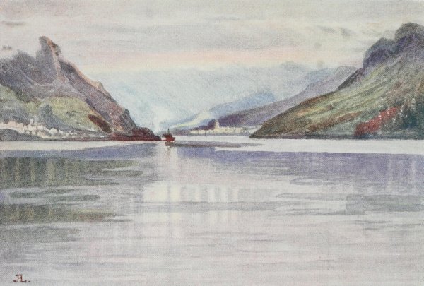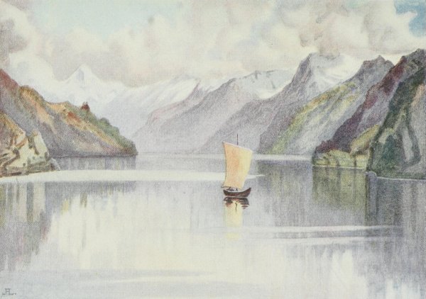 If Lucerne is the most widely advertised lake in the world—if its name, in recent years, has come to be associated, less with ancient gallant exploits of half-legendary William Tells than with cheap Polytechnic Tours and hordes of personally conducted trippers, it has luckily forfeited singularly little of its ancient charm and character, and remains, if you visit it at the right moment—or at any moment, if you are not too fastidious in your claims for solitude and æsthetic exclusiveness—possibly the most beautiful and unquestionably the most dramatic and striking of all the half-dozen or so greater lakes, Swiss or Italian, that cluster round the outskirts of the great central knot of Alps. "Cluster round the outskirts," for it is characteristic of all these lakes, just as it is characteristic of most of our greater English meres at home—of Windermere,6 for example, or Bassenthwaite, or Ullswater—that, though their upper ends penetrate more or less deeply (and Lucerne and Ullswater more deeply than any) among the bases of the hills, yet their lower reaches, whence discharge the mighty rivers, invariably trail away into open plain, or terminate among mere gentle undulations. Of all this class of lake, then—lakes of the transition—Lucerne is at once the most complex in shape, the least comprehensible in bulk, and the most immediately mountainous in character. The most complex in shape, because, though it is usual to describe this as a cross, yet the cross is so distorted in its lower and major member as practically to lose all really cross-like character, and to remind one rather of a wriggling viper. The least comprehensible in bulk, because there is actually no point on its surface, or on its immediate margin, or perhaps indeed anywhere, whence it is possible to grasp its basin as a whole, as it is possible, for example, in a rough kind of way, to grasp the shape and dimension of such a much larger lake as Geneva from the vineyards in the neighbourhood of Aubonne. The most immediately mountainous in character, because no other big Swiss lake, as already intimated,7 extends itself so deeply into the heart of giant hills, or is bordered so immediately by steep and rugged mountains. Thus Lucerne gains in surprise and mystery what it loses in simple graciousness; is dramatic and startling where other lakes are tranquil and merely soothing; and is certainly, to sum up, the most splendid and magnificent lake in the Alps, if not the most dignified and beautiful.