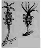Les trois autres figures qui suivent expriment trois principaux aspects de ces hydres-mères, qui, contractant de plus en plus leurs bras et leurs corps, élargissent en même temps leur pied, sou la substance agglutinante et brune auquel sont déposés les œufs de moins en moins espacés et tous ramenés à peu près au même niveau. Dans deux de ces figures les hydres mères sont vues de profil. La troisième représente une vue en dessus. Ces hydres-mères ne tardent pas à mourir ainsi entourées d'un cercle d'œufs agglutinés autour d'elles.