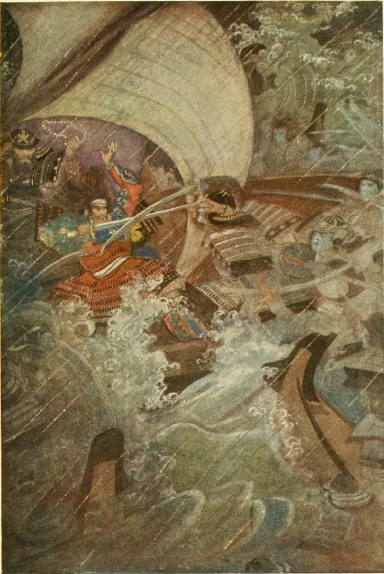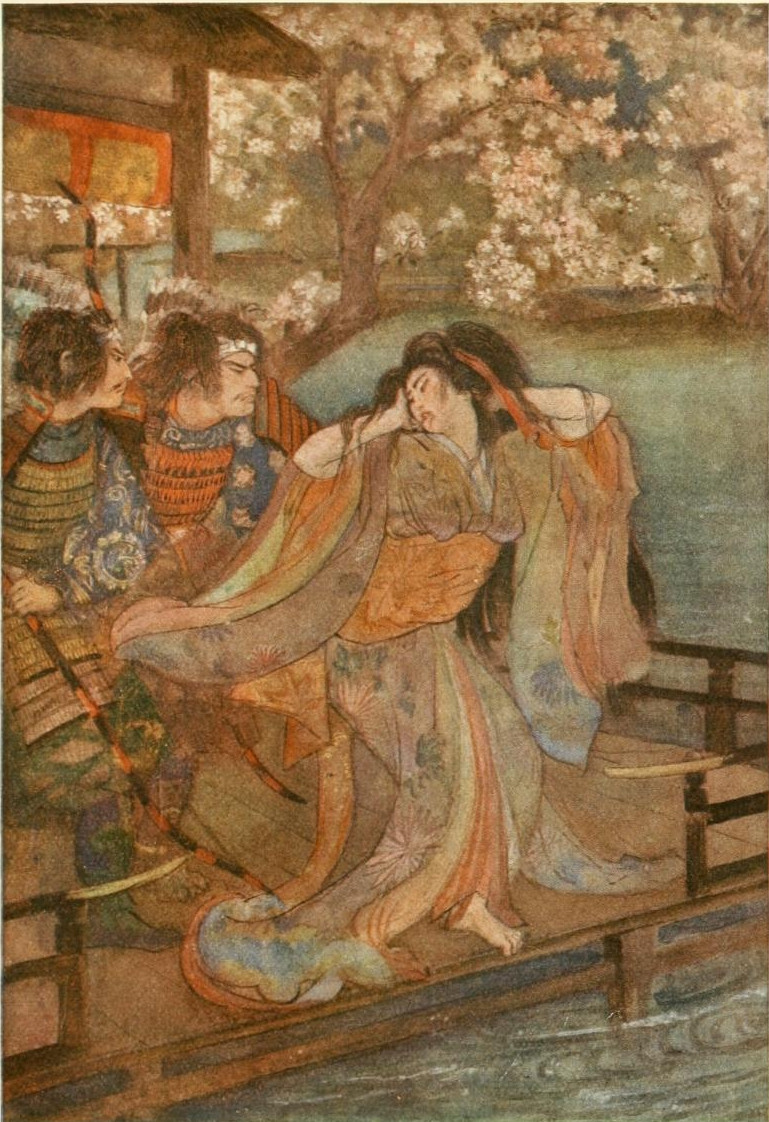 Benkei is one of the most lovable of Japanese heroes. He possessed the strength of many men, his tact amounted to genius, his sense of humour was strongly[Pg xvii] developed, and the most loving of Japanese mothers could not have shown more gentleness when his master's wife gave birth to a child. When Yoshitsune and Benkei, at the head of the Minamoto host, had finally vanquished the Taira at the sea-fight of Dan-no-ura, their success awakened the jealousy of the Shōgun, and the two great warriors were forced to fly the country. We follow them across the sea, over mountains, outwitting again and again their numerous enemies. At Matsue a great army was sent out against these unfortunate warriors. Camp-fires stretched in a glittering line about the last resting-place of Yoshitsune and Benkei. In an apartment were Yoshitsune with his wife and little child. Death stood in the room, too, and it was better that Death should come at the order of Yoshitsune than at the command of the enemy without the gate. His child was killed by an attendant, and, holding his beloved wife's head under his left arm, he plunged his sword deep into her throat. Having accomplished these things, Yoshitsune committed hara-kiri. Benkei, however, faced the enemy. He stood with his great legs apart, his back pressed against a rock. When the dawn came he was still standing with his legs apart, a thousand arrows in that brave body of his. Benkei was dead, but his was a death too strong to fall. The sun shone on a man who was a true hero, who had ever made good his words: "Where my lord goes, to victory or to death, I shall follow him."
