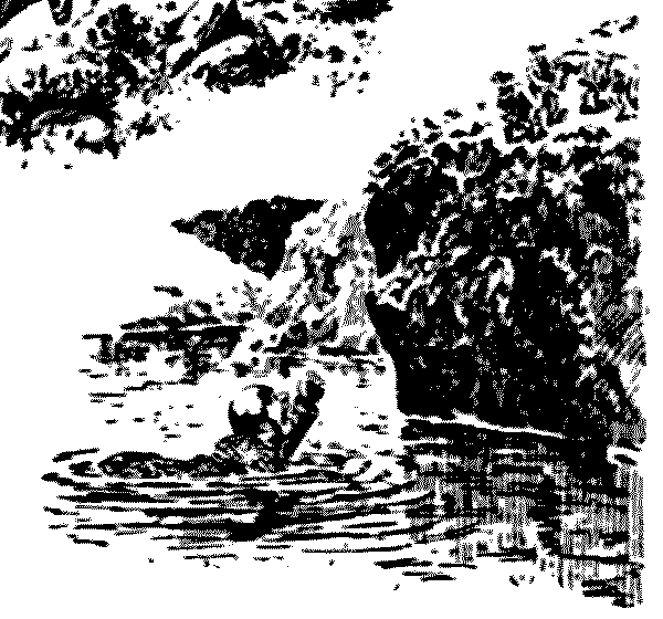 Stagger, stumble, violent bob forwards, recovery, trip up, and here one is in a sitting position in the bed of the stream. However, the high india-rubber breeks have kept the water out, except about a pailful, which gradually illustrates the equilibrium of fluids in the soles of one's stockings. However, I am on my feet again, and walking more gingerly, though to the spectator my movements suggest partial intoxication. That is because the bed of the stream is full of boulders, which one cannot see, owing to the darkness of the water. There was a fish rose near the opposite side. My heart is in my mouth. I wade in as far as I can, and make a tremendous swipe with the rod. A frantic tug behind, crash, there goes the top of the rod! I am caught up in the root of a pine-tree, high up on the bank at my back. No use in the language of imprecation. I waddle out, climb the bank, extricate the fly, get out a spare top, and to work again, more cautiously. Something wrong, the hook has caught in my coat, between my shoulders. I must get the coat off somehow, not an easy thing to do, on account of my india-rubber armour. It is off at last. I cut the hook out with a knife, making a big hole in the coat, and cast again. That was over him! I let the fly float[Pg 18] down, working it scientifically. No response. Perhaps better look at the fly. Just my luck, I have cracked it off!
