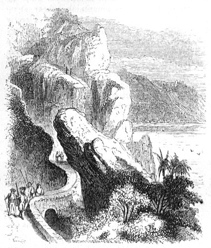 After remaining on the cliff about three quarters of an hour, to observe and to record every thing worthy of notice in the extended view before them, the party began to go down the pass to the shore. The descent was frightful, the pathway having been formed by zigzags down the cliff, the necessary width for the track having been obtained, sometimes by cutting into the face of the rock, and sometimes by means of rude walls built from below. As they looked back up the rocks after they had descended, it seemed impossible to them that any road could have been formed there—and yet so skillfully had the work been planned and executed, that the descent, though terrific, was accomplished without any serious difficulty. In fact, the road was so practicable, that loaded camels sometimes passed up and down. One of Mr. Robinson's companions had crossed the heights of Lebanon and the mountains of Persia, and he himself had traversed all the principal passes of the Alps, but neither of them had ever met with a pass so difficult and dangerous as this. The way was really dangerous as well as difficult. An Arab woman, not long before the time of Robinson's visit, in descending the road, had fallen off over the brink of the precipice to the rocks below. She was, of course, killed by the fall.