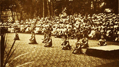 Their ballets always began with a musical prelude performed upon brass and bamboo instruments. Then, while some of the women struck up a religious chant and others clapped their hands in measured time, the dancers left the group one by one, shooting out and meeting in the ring; and a regular fanciful, childish drama was suggested by their movements, their gestures and their attitudes, which contrasted strangely with the sacerdotal repose of their features. They looked, at one time, like large, living flowers; at another, like automatic dolls.