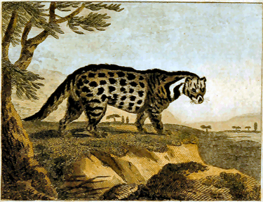 From inspecting the form of the feet it is easy to perceive that he walks and runs aukwardly; [247] it is said a man can overtake him without hastening his steps. He climbs up trees with great facility, hides himself in the leaves to catch birds, or hangs by the tail, the extremity of which is so muscular and flexible that he can clasp with it any thing he seizes upon. He sometimes remains a long while in this situation, his body suspended, with his head hanging downward, waiting for his prey. At other times he jumps from one tree to another, as the monkeys, with like muscular flexible tails, which he resembles also in the conformation of his feet. Though carnivorous, and even greedy of blood, which he sucks with avidity, he feeds also upon reptiles, insects, sugar-canes, potatoes, roots, and even leaves and bark of trees. He may easily be rendered a domestic animal, for he is neither wild nor ferocious; but he creates disgust by his smell, which is more offensive than that of the fox; his figure is also forbidding, for his ears are like those of an ounce, his tail resembles that of a serpent, his mouth is cleft to the very eyes, his body appears always dirty, because his hair is neither smooth nor curled, and seems as if covered with dirt. His bad smell resides in the skin, for his flesh [248] is eatable. The savages hunt this animal by preference, and feed on his flesh heartily.