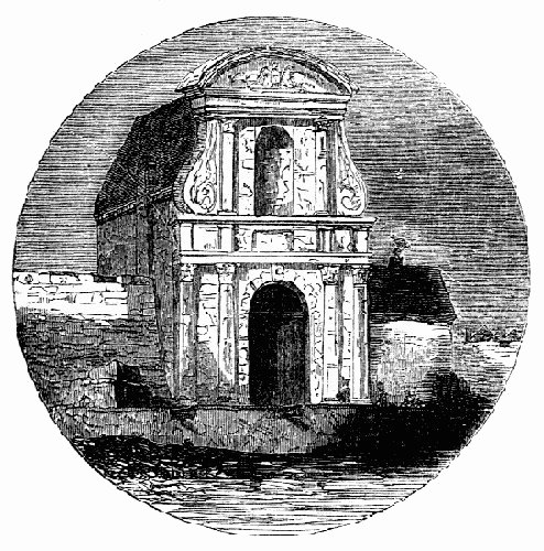 "Passing some cemeteries and public fountains, we came to the outskirts of the city, which consist chiefly of gardens producing olives, oranges, raisins and figs, irrigated by creaking water-wheels worked by donkeys. To one of these the droll contrivances which attracted our notice was affixed. The donkey who went round and round was blinded, and in front of him was a pole, one end of which was fixed to the axle and the other slightly drawn towards his head-gear and there tied: so that, from the spring he always thought somebody was pulling him on. The guide [Pg 682] told us that idle fellows would contrive some rude mechanism so that a stick should fall upon the animal's hind quarters at every round, and so keep him at work whilst they went to sleep under the trees."