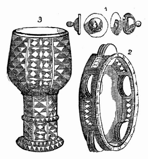 The music of the Hindoos includes eighty-four modes, each supposed to have a peculiar expression, capable of moving some particular sentiment or affection. The modes take their denomination from the seasons, or from the hours of day or night. Musical composition is supposed capable of adaptation to the different periods of the day, and therefore its provisions are regulated by the hours. The ideas of the Hindoos on music, as promoting the pleasures of imagination, may be inferred from the names applied by ancient authors to their musical treatises. One is called Rágárnava, the Sea of the Passions; another, Rágaderpana, the Mirror of Modes; and a third, Sóbhavinóda, the Delight of Assemblies; a fourth, Sangítaderpana, the Mirror of Song; and another, Rágavibódha, the Doctrine of Musical Modes. Some of these works explain the law of musical sounds, their divisions and succession, variations of scales by [Pg 684] temperament, and the enunciation of modes; besides a minute description of the different vínás (lute), and the rules for playing them. This is a fretted instrument of the guitar kind, usually having seven wires or strings, and a large gourd at each end of the finger-board. Its extent is two octaves, and its invention is attributed to Náredá, the son of Brahma. There are many varieties, named according to the number of their strings. Of one of them we give an engraving below.