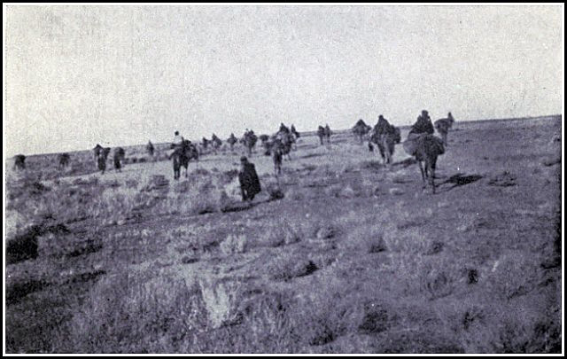 The officers were riding at the head of the caravan. When the first signs of the coming day began to appear behind the mountains that rose on our right, from out the flat surface of the desert, I supposed that all occasion for anxiety was now passed, as Bedouins never make their attacks by daylight. So I slung my rifle across my saddle, unbuckled my heavy cartridge belt, and rode slowly down the line to see whether everything was in order.