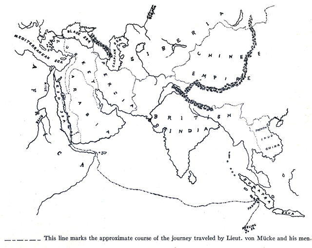 It was on the ninth of November, 1914, at six o’clock in the morning that I reported for duty to the commanding officer of His Majesty’s ship, Emden, Captain von Mueller, at the gangway of the ship. The Emden was lying at anchor in Port Refuge, a harbor formed by Keeling Reefs. Alongside were the two cutters in which the officers and men of the landing squad had already taken their places. The steam launch was ready to push off and tow them ashore. My orders were[2] to destroy the wireless telegraph and cable station on Direction Island, which is the most northerly island of the Keeling group, and to bring back with me, in so far as possible, all signal books, secret code books, and the like.