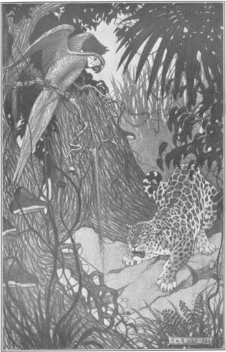 The rays did not have much time to sit there pitying him. Some distance behind the man the panther came jumping along with great leaps to catch him. The big wildcat stopped on the bank, and gave a great roar; but up and down the river the rays went calling; “The Panther! The Panther!” and they gathered together near the shore to attack him if he tried to cross.