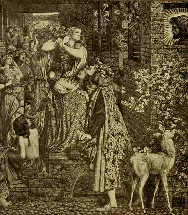 You should have wept her yesterday was done as an illustration to one of his sister's poems. It represents the return of the Prince after many delays to find his lady has died, believing him unfaithful. The ugly drawing of the Prince spoils an otherwise beautiful design. This ugliness is only compensated for by the six girls who turn their pitiful eyes so naturally from their prayer to look towards the Prince. The grace of girlhood in their faces must come as a revelation to some of Rossetti's critics.