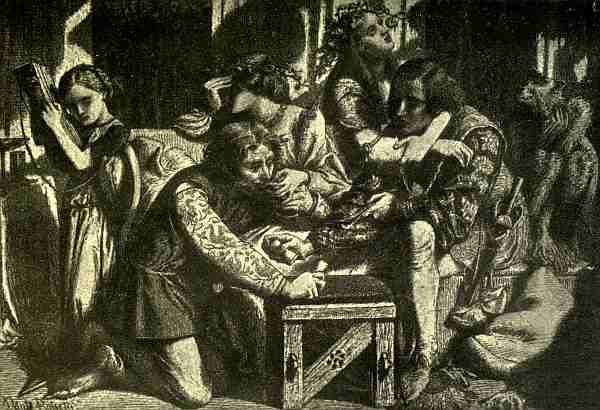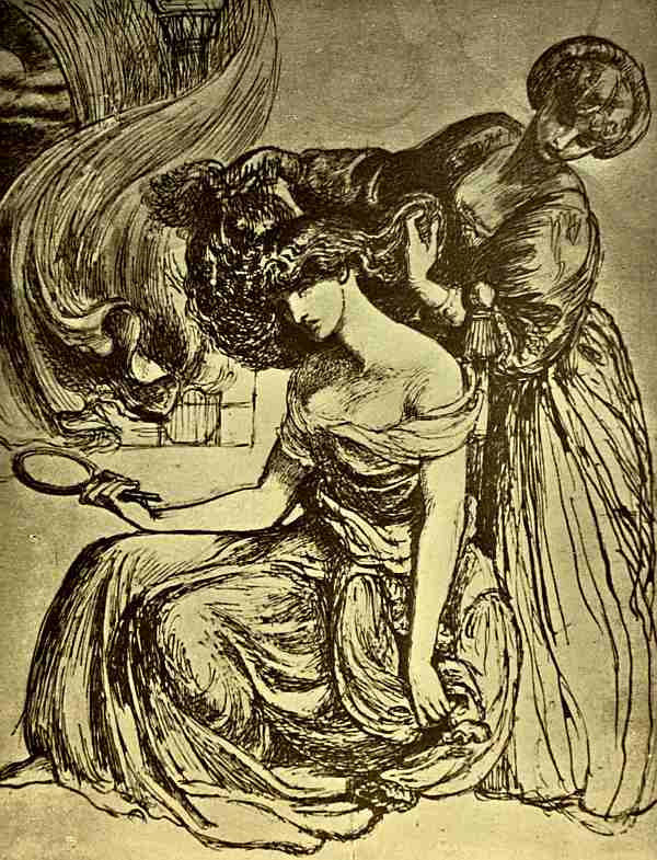 The first illustration for Desdemona's Death Song is simply a rough sketch, but even taken as such it shows how blind or how careless in the matter of form Rossetti at times could be. Here the lower part of the figure is so obviously lacking in proportion that it prevents us accepting an otherwise characteristic drawing as such. Still of Rossetti's best moments is the controlling grace of the bend in the maid's wrist, and the movement of her head as she combs Desdemona's hair. The curtain blown into the room by the wind is one of those touches Rossetti gives everywhere; by insistence on such an incident he makes us live the moments depicted in his pictures—just as we find ourselves in moments of extreme tension watching eagerly something absolutely trivial and making some accident portent with meaning.