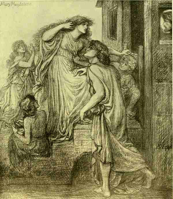 The best that art has given to us has often come from artists in a quite sub-conscious way. Because Rossetti's genius was so many-sided it is probable that he could explain most of what he did to himself, and if in the picture of which we have been speaking we take such a thing as the alterations between the figures in the background, and as they are shown in the sketch, it will seem apparent that he gave reasons to himself for everything in his compositions, and did not drift into anything by accident in aiming at design. In the sketch the nearest figure pursues the Magdalene beckoning, in the finished drawing her movements are arrested, she and the other figures pause before the door, speechless with cynical amusement and surprise as the Magdalene enters.