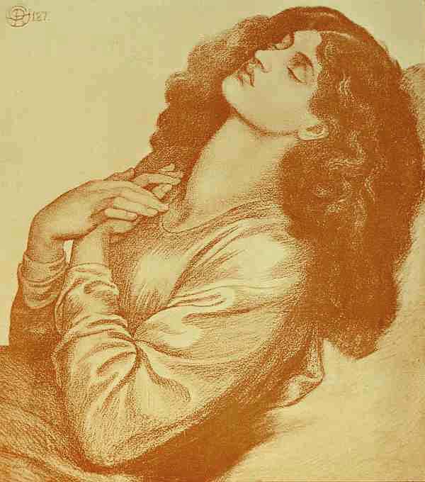 The figure of the Magdalene gains in many ways as completed, and though the distressed loving face and the flowing hair of the sketch are changed, the alteration of the expression on the face from one of intense distress to one of proud determination is very interesting as showing how his subjects grew and changed under his hand. It is wholly to the gain of the picture the different gesture which he has arrived at in the second drawing, where the Magdalene with both hands throws the flowers from her hair. The dramatic quality upon which we have insisted as part of Rossetti's art is nowhere better shown than in the deer quietly eating leaves from the wall, all unconscious that there is acted out beside it the most pathetically beautiful drama of the world. One misses in the finished picture some of the sensitive drawing given in the sketch to the Magdalene's dress. Here, instead, her clothes are as if she were perfectly still; they give no indication of her movements and the stormy action round her. That is the fault of Pre-Raphaelitism—to fritter away the spirit for the sake of the embroidery upon the body's clothes; to lose emphasis in elaboration, to sacrifice a greater beauty for a meaner one.