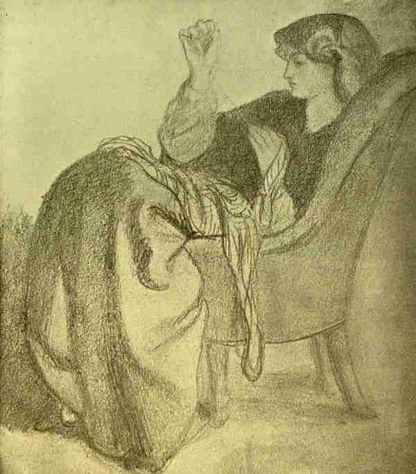 The drawing of the death of Lady Macbeth is one of the most wonderful things Rossetti ever did, and it is characteristically marred by imperfect drawing. The drawing is of great quality throughout, except for the figure with head averted. Some wonder why the ability to make the rest of the picture perfect failed the artist here. It is probably because the action of each figure is controlled only by the imaginative impulse that sways the whole composition, that gives to every part of it dramatic intensity as if executed all in one mood, bringing in one moment of creation the whole to life on paper. Those in sympathy with the nature of Rossetti's art do not count this piece of bad drawing a disastrous flaw. The rarity of genius makes them accept everything gratefully; it disarms a cavilling attitude. The fault in their eyes even seems to add to the tense note struck as a changed note in an over sweet harmony. Its dissonance breaks the monotonous rhythmic decoration, and its harshness relieves the detail so delicately wrought. Rossetti is of the extreme few who have finished minutely without sacrificing the qualities of greater significance than finish. His art is great enough to make us forget the detail and to render us for the time oblivious of it. In our absorption in the subject it seems for a time not to exist, only the tense mood exists, the intense moment. In a picture in which the moments are aflame with tragedy Rossetti drew this figure moving slowly and with decorative convention. All the figures are controlled by such a convention; they are partaking in a high drama. Such a convention as Irving has in the art of acting gives something to the dignity of tragedy. The conventions of Rossetti too are so much in the spirit of high [Pg 14] art, they conform so well to the claims of art, that they lend beauty to that power of his of giving to his drawings dramatic perfection. In regard to the particular figure of which we write it is better, faulty as it is, than if it had been redrawn in another mood and given again to the picture. It is to be regretted, of course, that it did not come rightly as it is, but it is less to be regretted than if he had substituted dead perfection for living imperfection, a studied and acquired idea of the pose in place of the instinctive one.
