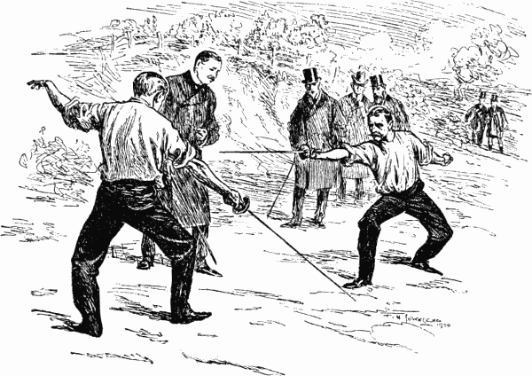 “That contingency,” I replied, “is worth considering, but a skilful swordsman would be very unlikely to resort to such methods. Why should he? If his opponent is a duffer, he has no need to be so tricky. If on the other hand his opponent is a cool-headed fencer, as skilful as himself, he knows the penalty of failure too well to make the attempt.