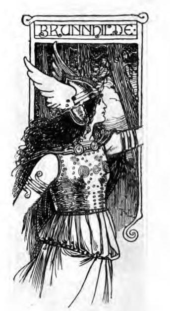 Then were her sisters full of pity for her, for none could "gainsay or resist her appeal; and in a company they ranged themselves upon a little rocky height that was there, all eight of them, and Brunnhilde they set in their midst, and she cowered down among them. Thus it might be that Wotan would suppose that she had not joined her sisters in fear of his displeasure, and that thus he might seek her elsewhere. And they whispered to her to be, of good cheer, and crouch low in the midst of them, and not answer to his call. This she did; and they grouped themselves round her on the rocky point, and thus awaited the coming of Wotan. Yet the bravest of them were afraid at the thought of the wrath that was coming, for they had seen him alight from his chariot on the mountain-top close above them, and in the calm of his anger there was that which was more terrible than the bellowing thunder or the lightning stroke. Then without haste came he down and stood before them. In his right hand he held the ashen spear, and his left hung by his side with fingers clenched, and his glorious face, before which the earth trembled, was very still and set; only the point of his spear trembled like an aspen leaf as he held it, and the Valkyries knew the wrath that shook him. Then he opened his mouth and spake very gently.