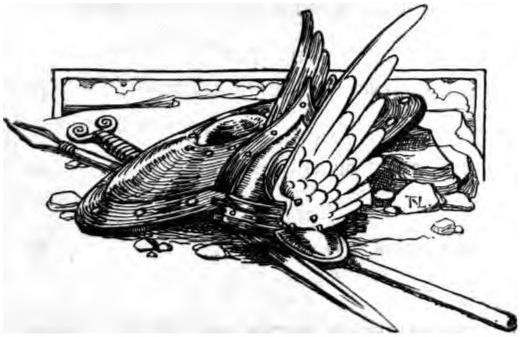 And even as he spoke, and as on her eyes and mouth the god's lips were pressed, her eyes closed softly, and her mouth was shut, and softly she sank, untroubled, and like a child tired with play, into his encircling arm. And softly did Wotan take her up in his strong grasp, and softly and very tenderly he laid her on a low mossy bank that had spread its velvet beneath the shade of a whispering pine. Then looked he the last time on her peaceful and sleeping face, and raising her head he put there her helmet, and shut down the vizor, so that none could see her face. Then he looked once more, now that her face was gone from him, at the gentle swell of the bosom of maidenhood, and at all the beauty and strength of her tireless limbs; and then took her steel shield and laid it on her body, and her spear he laid lightly on her outstretched arm. Thus all his work with her was accomplished, and there remained only that he should fulfil the boon which he had granted her; and with firm step he went a little space away and called with loud voice on Loge, the flickering god of fire.