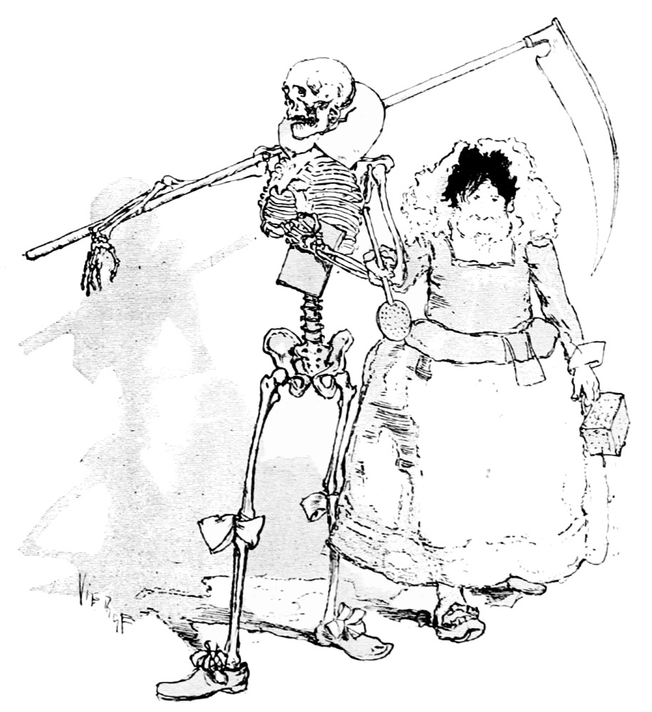 I cannot point out whether these drawings, from the author’s point of view, illustrate the text. I have never read the whole book. But I only care to consider the illustrations as the most remarkable series of little pictures in black and white that have been produced. That this will be admitted I do not believe for a minute. More probably Dürer or Botticelli will be cited, and the nobility of their composition extolled, and the purity of their ideals dilated upon, while the meanness of Vierge’s imagination, and the baseness of his ideals, are exhibited as a painful contrast. I find, however, Vierge’s true and brilliant realism much more interesting than the conventional idealism of the past. The man who can interest and delight you by the way he draws an old shoe, or a broken pot, as Vierge has done, is quite as great as he who must take a heavenly host to produce the same impression.