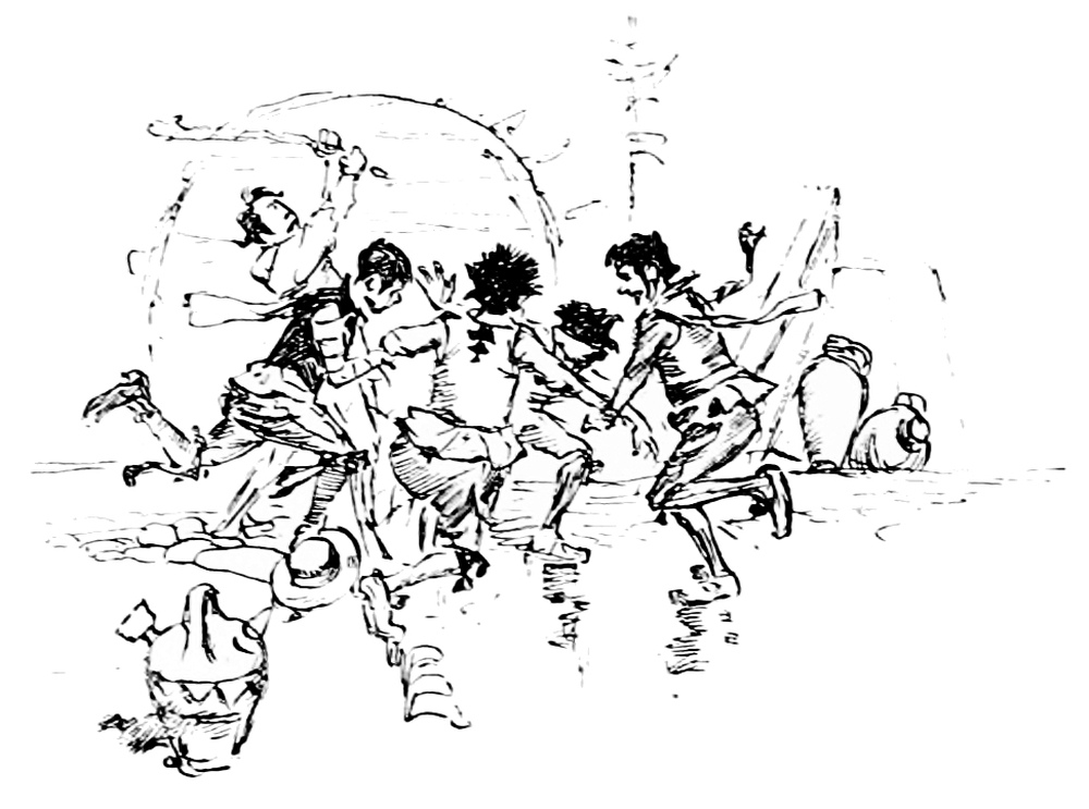 Vierge’s first edition of this book was published in Paris in 1882, by Bonhoure, and the drawings not only made his own name famous throughout the entire artistic world, but renewed the popularity of Quevedo. The book—and when I speak of it I refer to the illustrations and not to the letter-press—was the most brilliant, the most daring, the most original which had ever appeared. From the head-piece of the first chapter nearly to the end, almost every page contained a perfect picture which amazed all who studied it, and delighted all who could appreciate it. These exquisite little drawings displayed a knowledge of form, of action, of light and shade, of architecture, expressed with a brilliancy of handling which has never been surpassed. To make such a statement is to challenge criticism. But if there have been any more artistic drawings, or engravings of drawings, produced from the time of Dürer or Bellini, Rembrandt or of Piranesi, I have yet to find them, though I have gone in search of them through the chief Museums and Galleries of Europe. In comparison with Vierge, Dürer knows nothing of light and shade, Bellini and Vandyke and Holbein are heavy and laboured in their handling, while Piranesi and Canaletto have but an historical interest. It is true that to-day in many ways by many men Vierge is nearly approached, but he has been the inspirer and the master of them all.
