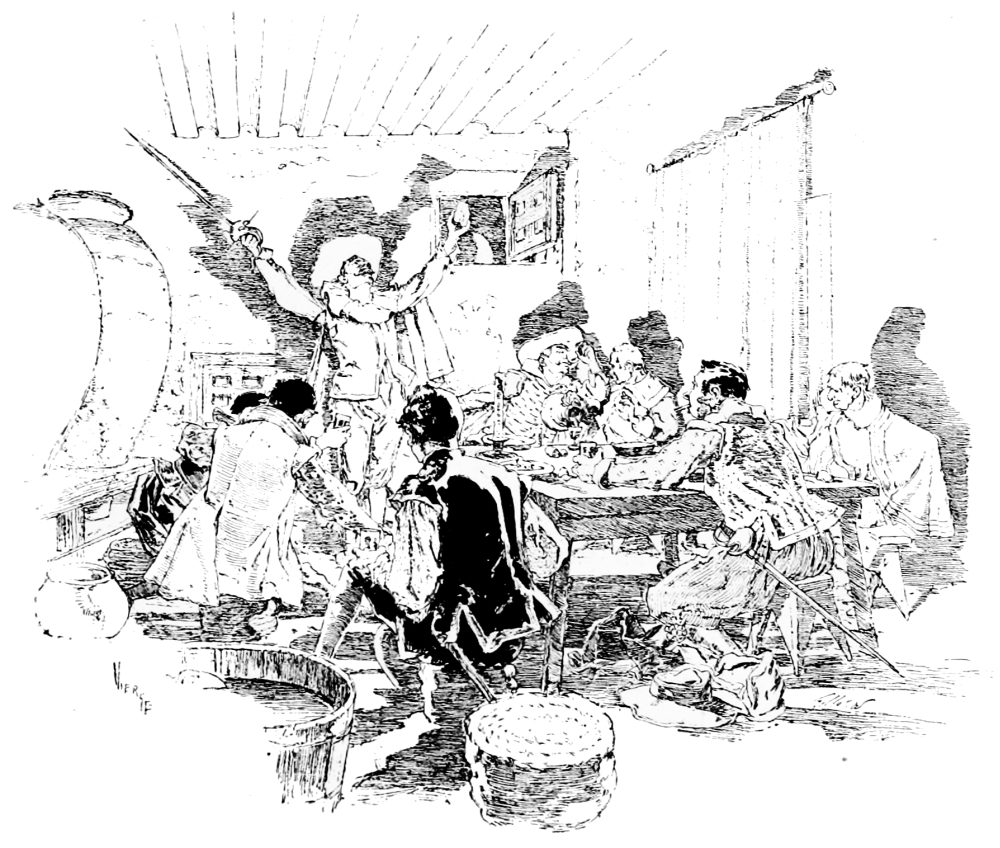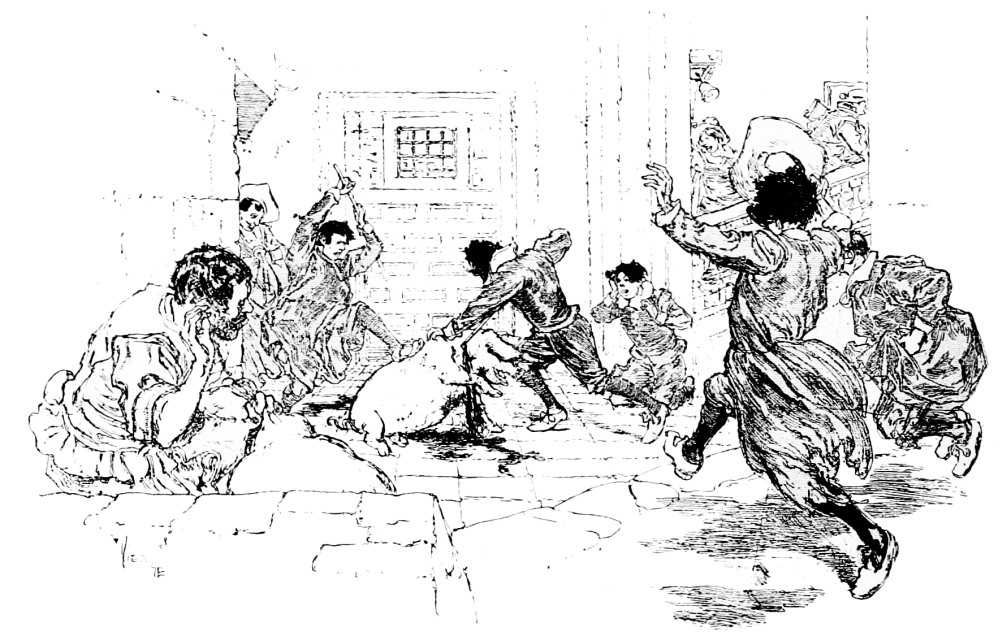Being master of these arts, I got to Seville at my fellow-travellers’ expense, winning all the hire of the mules, my other charges, and money to boot, of them and my landlords at the inns. I alighted at that they call The Moor, where I was found out by one of my schoolfellows at Alcalá, whose name was Mata, but he, thinking it did not make noise enough, had changed it to Matorral. He dealt in men’s lives, and sold cuts and slashes, a trade which throve well with him; he carried the sign of it on his face, where he had received his share. He always made his bargain to a nicety for length and depth, when he was to bestow any, and said, “No man is so absolute a master, as he who has been well hacked and hewn himself.” And he was in the right, for his face was one seam, and himself all slashes. He told me, I must go sup with him and his comrades, and they would bring me back to the inn. I went with him, and when we were in his lodging, he said, “Come, spark, lay by your cloak and look like a man, for this night you shall see all the brave fellows in Seville; and that they may not look upon you as a cully, tumble your band, thrust out your back, and let your cloak hang loose, as if it were dropping off, for we hate to see any man’s cloak set fast upon his back. Screw your chops about, and make faces with both sides of your mouth, then talk big, using the rough words of us gentry.” I learned his lesson, and he lent me a dagger, broad enough to have been a scimitar, and for length it wanted nothing of a sword but the name. Now drink off this quart of wine,” said he, “for without you vapour you will not look like a true bully.” We had gone so far in my instructions, and I was half seas over with what I had drank, when in came four of the gang, with faces like old gout-shoes, bound about the middle like monkeys with their cloaks instead of ropes, their hats standing a tiptoe on their heads, and cocked up, as if the brims were nailed to the crowns; a whole armourer’s shop about them in swords and daggers, and the points of them beating against their right heels; their eyes staring, their whiskers turned up, and their beards like brushes. They made their compliment with their mouths, and then, in a hoarse tone, and clipping their words, saluted my companion in a gibberish, who answered in like manner. They sat down, and spoke not one word to ask who I was, but one of them looking at Matorral, and opening his mouth, thrust out his under lip, by way of pointing at me. My introducer answered in the same language, laying hold of his beard, and looking down; after which they all got up, embraced, and expressed a great deal of kindness for me. I returned the same compliments, which were like smelling to so many hogsheads of wine. When it was supper time, in came a parcel of strapping scoundrels to wait at table, whom the topping bullies call under-spur-leathers. We all sat down together at table, and the first thing they served up was a dish of pickles, which as soon as they had tasted, they all fell to drinking to my honour, by way of welcome; and till I saw them drink to it, I must confess I never knew I had any. Next came fish and flesh, all of it high seasoned to promote drinking. There was a great bowl full of wine, like a half tub, on the ground, and he that was to pledge, lay all along to drink by wholesale. I was taken with the contrivance, but by the time a few healths had gone about we none of us knew one another. They fell to talk of warlike affairs, and oaths flew as thick as hail. A matter of twenty or thirty persons were cut out for destruction. The Mayor of the city was adjudged to be cut in pieces; then they talked of the glorious memory of Domingo Tirynado and Gayon, and poured out wine in quantity for the soul of Escamilla.[22] Some that were maudlin wept bitterly, calling to mind the untimely end of Alonzo Alvarez, one of their brethren, whose body was exposed on a gibbet for the crows to feast on. By this time my companion’s brains were turned topsy-turvy, and laying hold of a loaf, and looking earnestly on the candle, he said with a hoarse voice, “By this, which is the face of God, and by that light which came out of the angel’s mouth, if you think fit, gentlemen, we will this very night maul the sergeant’s man that pursued our poor one-eyed friend.” They all set up a dismal cry, ratifying the proposal made by an oath after this manner: They drew their daggers, laid their hands on the edge of the bowl, and lying along with their chops to it, said, “As we drink this wine, so will we suck the blood of every informing catchpole.” “Who was this Alonzo Alvarez,” said I, whose death is so much regretted?” “He was,” answered one of them, “a brave fighting lad, a man of spirit, full of mettle, and a good companion. Let us go, for the devil begins to be strong in me.” This said, we all went out a catchpole-hunting. Being quite overcome with wine, and all my reason drowned, I never reflected on the danger I was running myself into. We came to the Strand, where we met the round, which no sooner appeared, but our swords were drawn and we attacked them. I did like the rest, and at the first charge we made way for the filthy souls of two catchpoles to fly out of their bodies. The constable took to his heels, and ran up the street, crying out for help. We could not pursue, because he had too much the start, but took sanctuary in the cathedral, where we were sheltered against justice, and slept as much as was requisite to discharge the fumes of the wine we had drank. When we came to our senses, I could not but wonder that two catchpoles should be killed by, and a constable fly from, a parcel of mere hogsheads of wine, for we were no better at that time. We fared well in our sanctuary, for the gay nymphs of the town flocked to us, and spent all they had upon us. A strapping jade, called La Grajales, took a fancy to me, and clothed me from head to foo