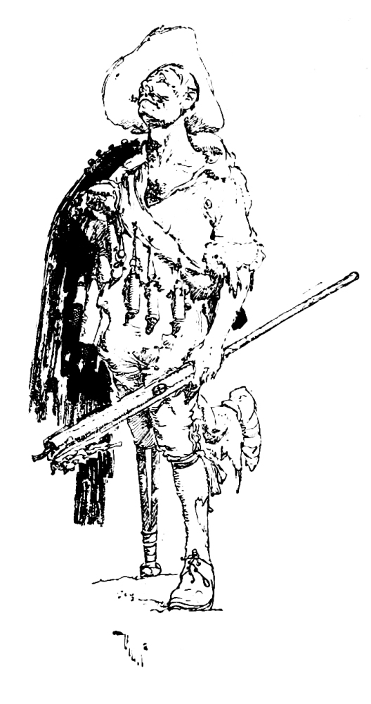 When it was dark night we all went home, and, coming in, I found the counterfeit soldier, that had the clouted leg, with a white wax flambeau they had given him to attend a funeral, and he run away with it. This fellow’s name was Magazo, born at Olias; he had been captain in a play, and had fought abundance of Moors in a sword-dance. When he talked with any that had served in the Low Countries, he told them he had been in China; and if he happened to meet with any that had been there, he pretended he had served in Flanders. He talked much of encamping, and lying out in the field, though he had never been in any unless it were to louse himself; named abundance of strongholds, and knew none but the common gaols; highly extolled the memory of Don John of Austria, commended the Duke of Alva for a generous, true friend, and had abundance of names of noted Turks, galleys, and great officers at his fingers’ ends, all which he had picked out of a ballad then in vogue concerning the like affairs. But being altogether unacquainted with geography or anything of the sea, discoursing about the famous battle of Lepanto, he said that Lepanto was a very brave Turk. The poor wretch was so ignorant that he served to make us excellent sport.