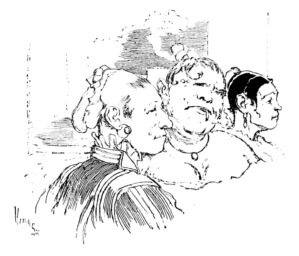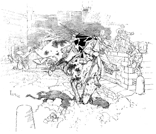 The ninety little process blocks in Bonhoure’s edition showed the knowledge of the past, combined with the brilliancy and go of the present. But after a certain page there came a blank, and the letter-press dragged on—a libretto without the music. All that one knew was contained in a short note by the publisher: Vierge had been stricken with a grave malady, for some years he disappeared as a working artist. Those years, however, were spent in struggling against an affliction which would have killed a man less strong, but from which he has emerged able to complete his most important work. I am sure that Vierge would be the last, either himself to advertise his frightful misfortune, now happily over, or to wish to have it advertised by others. It is enough to say that when his entire right side was paralysed, and he lost the power of speech, he simply trained himself to work with his left hand, and to-day, as is proved by the last twenty illustrations in this book, and the pages of Le Monde Illustré week after week, he is producing drawings which are unsurpassed.