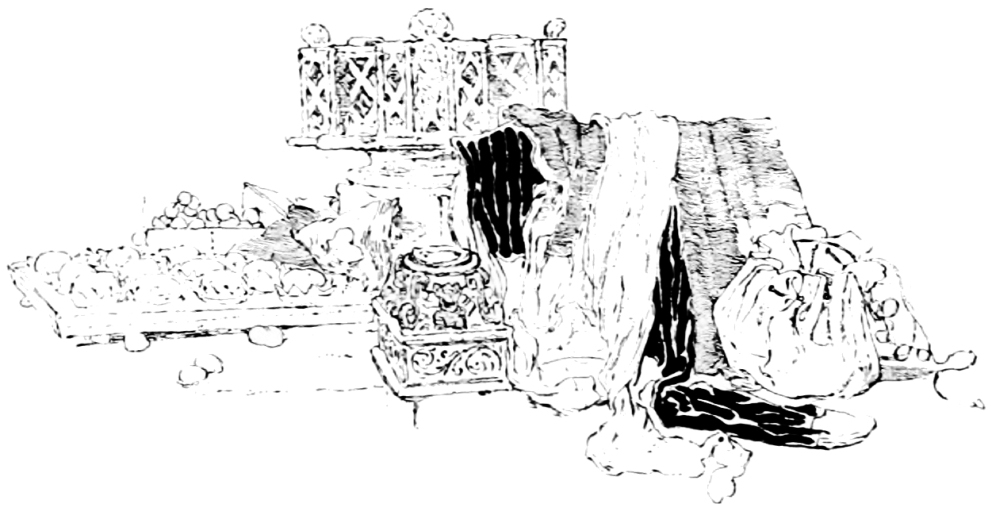 The drawings were made upon white paper—Bristol board or drawing paper—with a pen and liquid Indian ink. Vierge uses now a glass pen like an old stylus, and this, I believe, he prefers to all others. The drawings were then given to Gillot, the photo-engraver, who, by means of photography and handwork, produced in a metal block a reproduction of the original drawing which could be printed with type. It is a favourite, but fallacious, statement of the art critics that mechanical reproduction not only ruins the drawing, but is not to be compared to facsimile woodcutting. This is absolutely untrue if the artist is a craftsman, and the engraver, who is a craftsman, is also an artist. Vierge and Gillot fulfill these conditions. No woodcutter, not even Whitney, Collins, Gamm or Léveillé (there are, unfortunately, none in England to be considered) could reproduce any one of these drawings in the wood a bit better than Gillot has done by the mechanical process. Many of Vierge’s lines are so clear and so pure and so simple, that they would be comparatively easy to cut in the wood. Other arrangements of lines are so complex, that no woodcutter could ever follow them, but would have to suggest them. Gillot has reproduced them perfectly, and almost altogether by mechanical means. But, granted that the woodcutters could have made equally good reproductions, unless you could find a consummate artist, who, for the love of the thing, was willing to give years of his life to it, it would be much more sensible to do what has been done—give the work to a mechanical engraver like Gillot. For the woodcutter would be sure to put some of his own personality into his block, and for my part I prefer Vierge unadulterated. But it is one of the art critic’s absurd canons of belief that in taking work away from woodcutters and handing it over to mechanical reproducers you are ruining the art of wood-engraving. The process man has merely removed much drudgery from the wood-engraver, and obtained for him the chance to produce work of his own. In the reproduction of pen drawings like those of Vierge, nearly as much depends upon the printer as upon anyone else, and I look forward with much interest to the appearance the book will present. Even authorities on the subject of illustration continually go wrong in this matter, by accusing artists, who know perfectly well what they are about, of being unable to draw for reproduction, when the engraver’s proofs which are sent them are almost perfect, though the final result is almost invariably ruined, owing in some degree to the artlessness of printers, who, of course, in a fine book should never be trusted, but principally to the imperfections of the modern steam-printing press, and quality of the paper supplied by publishers. No illustrated book can have full justice done to it unless it is printed by hand as carefully as an etching. No art critic displays anything but his small knowledge of the subject when he blames the artist for what may be due to the incapacity of the engraver or the imperfections of the press. Though the critic and the public have only to consider the result—the printed book—in almost every case, the artist is absolutely helpless, as he is not allowed to have anything to do with this result. That comparative perfection may be reached has, however, been shown, on the one hand, by the productions of the Kelmscott Press in hand-work, and, on the other, by the De Vinne Press with steam.