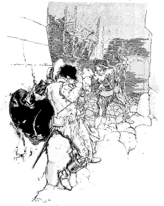 However, it cannot any longer be said that the illustrator’s life is not reasonably successful. The Paris Exhibition of 1889 brought the gold medal, to which I have referred, to Vierge for these very drawings, and the French nation has since decorated him, and in his case it certainly was a reward for merit and nothing else. Then, also, in illustrating a book like Pablo, of course a certain amount of latitude was allowable. The artist could pick and choose his architecture in the most picturesque spots of Spain, and produce a harmonious whole. Nor did he have to consider Quevedo’s personal whims; in this case the author, being dead, could not demand that the artist should illustrate exactly those portions of his work which are not illustratable, or which do not appeal to him. He could work away at just the time when he wished to; having no Salon to get ready for, he could make his drawings in whatever fashion he chose, trying all kinds of methods and experiments, with no hanging committee to reject him because his originality would cast their own productions into the shade; he could then have his drawings joyfully accepted by a publisher, and work sympathetically with the engraver and printer. But it was just when he thought success within his grasp, and the book was almost finished, that he was paralysed. Vierge’s case, so far as the first edition of Pablo is concerned, is one of the most cruel. The relations of artists and publishers that is, publishers who understand the production of fine books—have usually been happy. But there are exceptions.