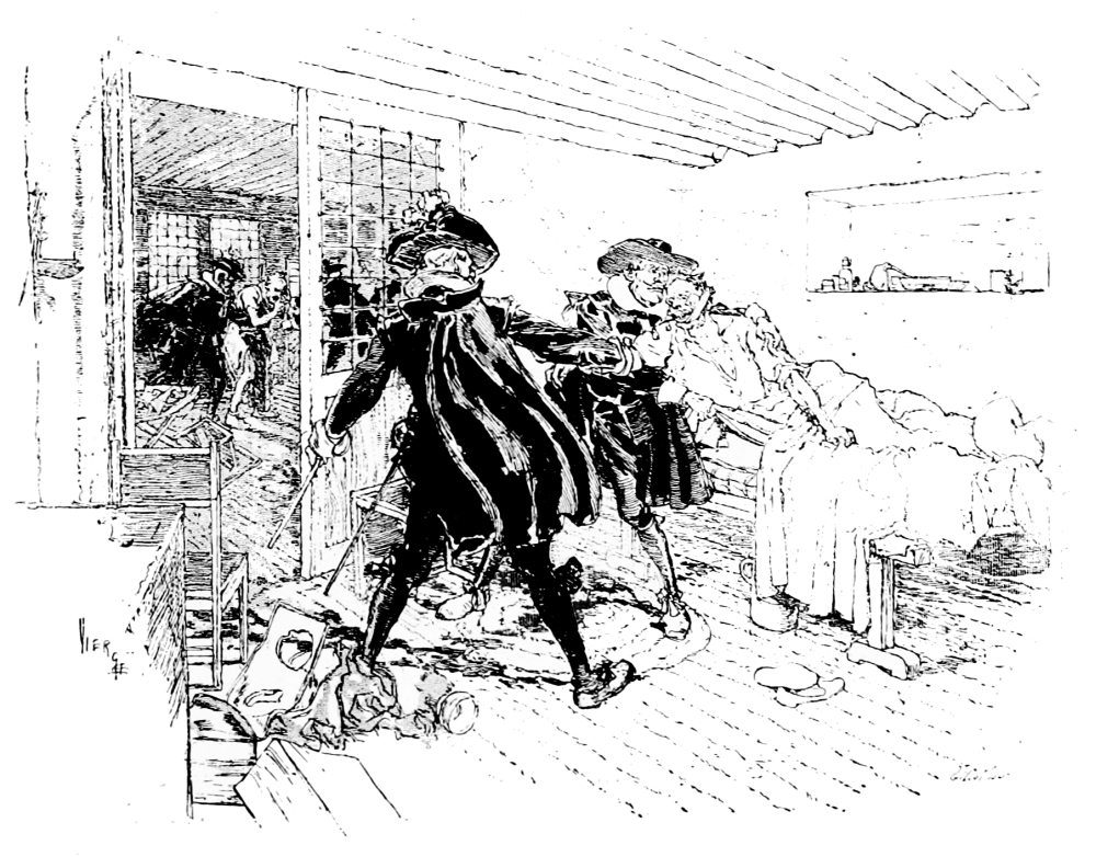 I perceived that all her discourse and long speech ended in a dun; for though that was her text, she did not begin with it as others do, but made it her conclusion; when I found that I was not at all to seek for the occasion of her loving visit, which was the first she made me whilst I lodged in her house, excepting only one day, when she came to answer for herself, because she heard I had been told some story about her witchcraft, and that when the officers came to seize her, she had cast such a mist before their eyes, that they could neither find the house nor the street. She came then to tell me it was all a mistake, for they meant another of her name; and no wonder, for there were more of the name and profession. I paid her down the money, and as I was telling it out, ill fortune, which always attends me, and the devil, who never forgets to plague me, so ordered it, that the officers came to seize her for a scandalous liver, and had information that her gallant was in the house. They came directly into my room, and seeing me in bed and her by me, they laid hold of us both, gave me half a score good blows, and dragged me out of bed. Two others held her fast, saluting her with the titles of bawd and witch. Who would have thought it of a woman that lived as I have said? The noise the constables made, and my cries, gave the alarm to her gallant, who was a fruiterer, and lay in the next room within. He set off a-running. They observing it, and being informed by another lodger in the house that I was not the man, scoured after, and laid hold of him, leaving me well beaten and my hair torn off; yet for all I had endured, I could not forbear laughing to hear how the dogs complimented the old woman. One cried, “How gracefully you will look in a cart, mother; by my troth, it will be a great satisfaction to me to see a thousand or two of rotten oranges and turnip tops fly after you.” Another said, “We have taken care that you shall make a good show, and be well attended.” At last they caught her bully, bound them both, begged my pardon, and left me to myself.
