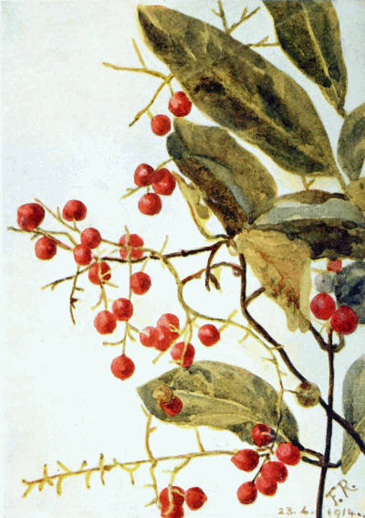 To-day I made acquaintance for the first time with the New Zealand "rata," one of the finest of the forest trees, attaining a height of fifty to a hundred feet. The rata is a species of myrtle, and was covered just now with crimson myrtle flowers, which in the sunlight turned a vivid scarlet, so that in patches the bush seemed to be on fire.