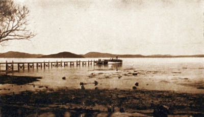 The usual plan for visitors is to make up a party of twenty or thirty from one of the hotels, hire a boat, take lunch, and boil the billy in one of the charming bays which abound all round the island. The day after I arrived was bright and sunny, just the day for such an[22] expedition, and a large party of us started gaily in a motor sailing-cutter on a trip to Glory Bay and Ulva Island. The sea was calm, with sufficient wind blowing for us to dispense with the motor engine and trust only to the sails—a much pleasanter way of travelling than by motor. We had a delightful two hours' run to Glory Bay, where we anchored, and were all landed in a small rowing boat on a beach covered thickly with grey pebbles, large and small. Here we found a convenient fireplace fixed up—two iron supports firmly fastened in piles of stones, a stout branch of a tree laid across the uprights, and on the branch iron hooks dangling—all provided by Government, to prevent any danger of damage to the bush by careless picnic parties. On the hooks three billies were hung, a fire of sticks was lighted underneath, and when the water boiled, tea was sprinkled into each billy. In a few minutes the tea was ready, and we had cups of it ladled out to us with an enamelled mug, and sat down on the beach to an excellent picnic lunch of meat sandwiches, jam sandwiches, and tea. The trees and ferns came right down to the beach, and we looked across the quiet bay through a framework of greenery to a wooded island with the open sea beyond.