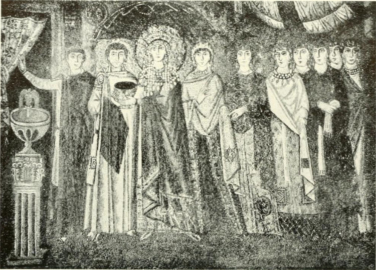 [1] Siehe z. B. das Mosaik in Ravenna, welches in der Hauptgruppe ein Dreieck bildet. Zu diesem Dreieck neigen sich immer weniger bemerklich die übrigen Figuren. Der ausgestreckte Arm und der Türvorhang bilden die fermata.