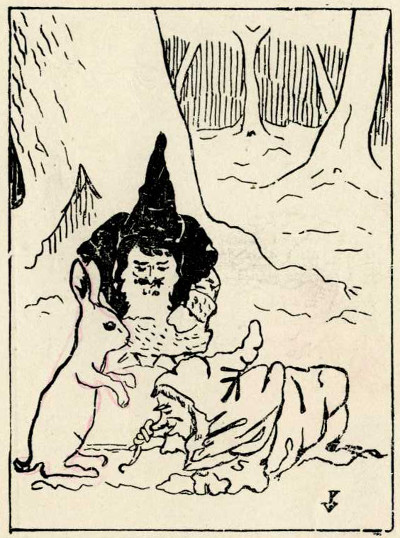 Nu namen ze voorzichtig het konijntje van 't meisje aan. Maar 't was te zwaar voor één kaboutertje en daarom droegen ze het met hun beiden. Toen ze er mee wegstapten zeiden ze heel vriendelijk: "Dag Boschwachterskind."