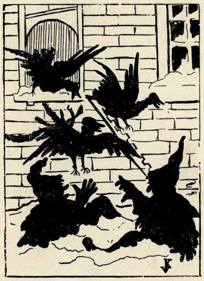 Kobold nam 'n groot mes, dat wel 'n vinger lang was en Gnoom balde de vuisten. Moedig stapten ze voort naar den ingang van het hol. Toen Kobold naar buiten keek, wierp hij het vreeselijke mes op den grond.