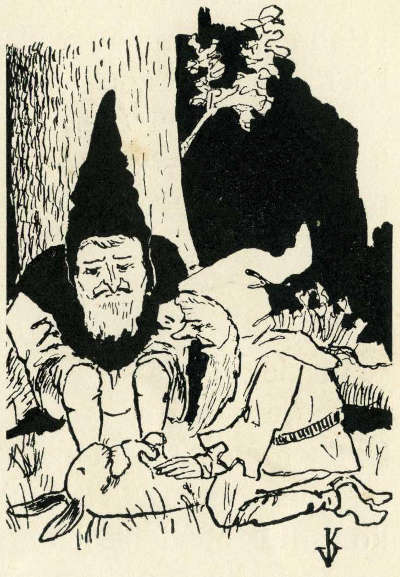 Ze liepen heel zachtjes en maakten een omweg, zoodat ze achter Troll kwamen en toen slopen ze op hun tenen naderbij. Troll sliep. Kobold en Gnoom gingen stilletjes naast hem liggen. 'n Minuut of tien hadden ze gelegen, toen Gnoom al begon te wenken aan Kobold dat ie 't tijd vond om Troll wakker te maken. Kobold nam nu een lange grashalm en gaf die aan Gnoom en beduidde hem, dat-ie daarmee Troll maar eens in z'n gezicht moest kittelen. Dat deed Gnoom met het grootste genoegen. Troll voelde er eerst niets van, maar begon langzamerhand allerlei gezichten te trekken en eindelijk aan z'n neus te wrijven, doch Gnoom hield niet op voor Troll met een geeuw wakker werd. Hij wreef z'n oogen uit en deed ze toen zoo wijd open als hij maar kon, want hij zag iets waar hij niemendal van begreep: naast hem lagen Kobold en Gnoom! Hij dacht eerst dat ie droomde, maar bemerkte al heel gauw, dat ie klaar wakker was. Bleek van schrik stotterde hij: