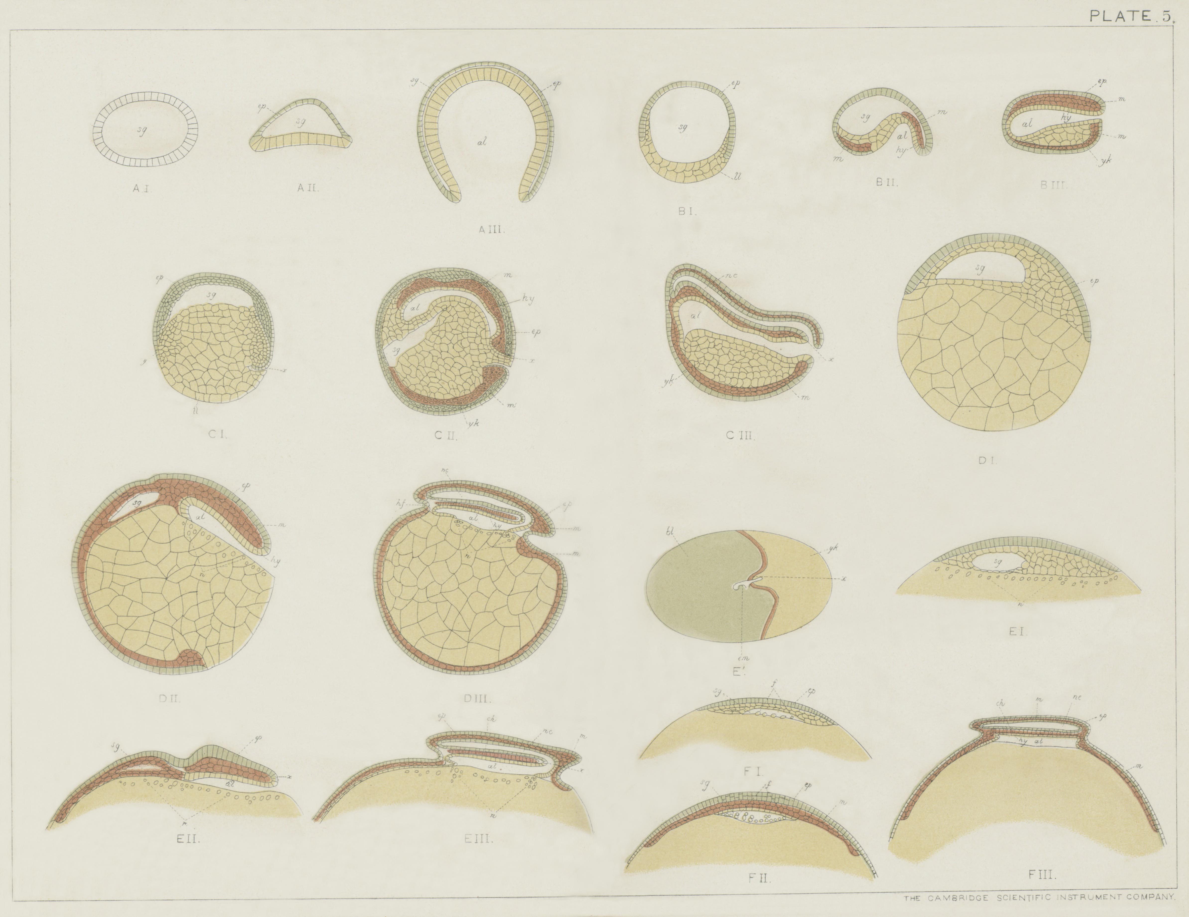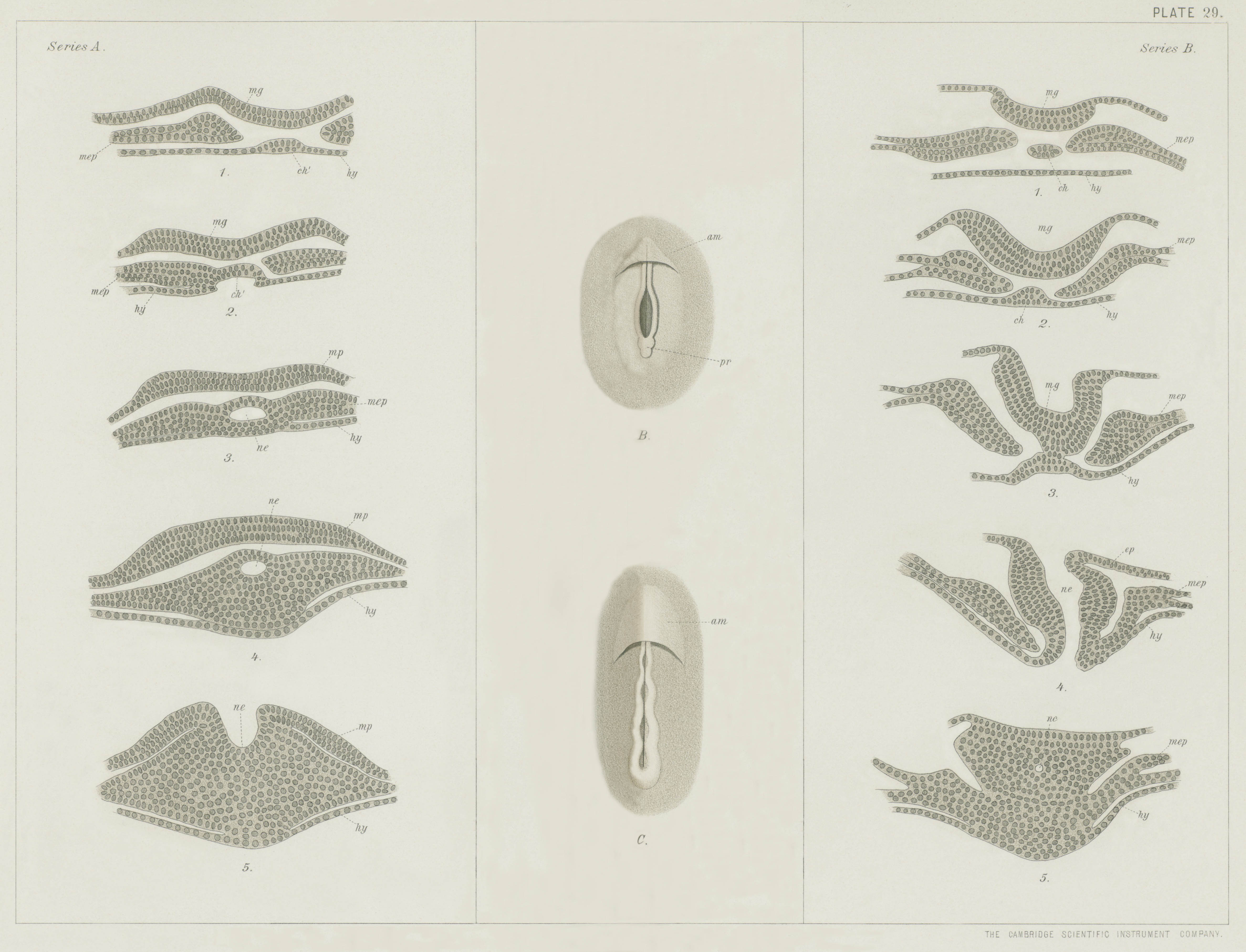 bl. Blastopore. ep. Epiblast. hy. Hypoblast. me. Mesenteron. mes. Mesoblastic somite.