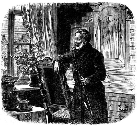 Da kommt der Lehrer selbst, seine Bücher unter dem Arm; aufmerksam betrachtet er das Zerschmelzen einer Flocke auf seinem fadenscheinigen schwarzen Rockärmel. Jetzt ist die Zeit für einen Märchenerzähler, für einen Dichter. — Ganz aufgeregt schritt ich hin und her; vergessen war die böse Zeit; auch mir war, wie weiland dem ehrlichen Matthias, ein großer Gedanke „aufs Herz geschossen“. „Ich führe ihn aus, ich führe ihn aus!“ brummte ich vor mich hin, während ich auf und ab lief; wie verwundert mich auch alle meine Quartanten und Folianten von den Büchergestellen anglotzten, wie spöttisch auch das Allongeperückengesicht auf dem Titelblatt der dort aufgeschlagenen Schwarte hergrinzte!