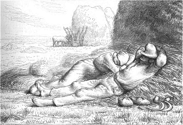 L'heure de la moisson a sonné. Le grain n'est plus en lait et facilement se coupe avec l'ongle; le chaume est devenu blanc. C'est le bon moment. Aussi, dès l'aube, en ce chaud mois de juillet et dans le mois suivant, selon la région, des essaims de moissonneurs, comme des nuées de sauterelles, s'envolant de tous les villages, vont-ils s'abattre à travers la plaine où ondulent les épis. Tous sont armés de l'arme du pays; ici, de l'antique faucille à la lame finement dentée; là, de la sape ou fauchon et de son crochet; ailleurs, de la grande faulx. Ces autres s'avancent, entourant quelqu'une de ces machines nouvelles inventées par celui-ci ou perfectionnées par celui-là, véritables mitrailleuses du sillon qui d'un seul coup couchent par terre les épis par milliers. Mais ces bataillons-là sont rares. Tout le monde ne peut pas se payer le luxe ni s'assurer les avantages de cette grosse artillerie. Sur bien des points, le petit fermier et le petit propriétaire tiennent encore pour la faucille. Cela va moins vite, il est vrai, mais cause moins de perte. Et le temps importe peu, quand la main-d'œuvre est à bas prix. Par exemple, la fatigue est double, mais on ne s'en aperçoit pas quand on a du cœur au travail, à preuve Mathurin et Mathurine sa femme, qui jamais n'ont boudé devant la besogne. Et nul mieux qu'eux ne sait habilement trancher sa poignée d'épis, égaliser une javelle, lier une gerbe, former une moyette et la coiffer. Toujours à leur affaire, sans s'arrêter une minute, sinon pour manger la soupe, et, comme de juste, faire la méridienne. A ce moment là, d'ailleurs, la chaleur est grande aux champs, le travail presque impossible. Le soleil darde d'aplomb sur la terre ses rayons de feu qui semblent mordre. Bon gré, mal gré, il faut donc fuir, chercher l'ombre, prendre quelques instants d'un indispensable repos, dont la nature elle-même paraît éprouver le besoin. Tout cède au sommeil; le fauve se retire en son gîte; l'oiseau sous le buisson se cache et se tait. Insensiblement tous les bruits s'éteignent, et bientôt le silence n'est plus troublé que par le cri strident de la cigale claquetant seule dans l'espace immense...
