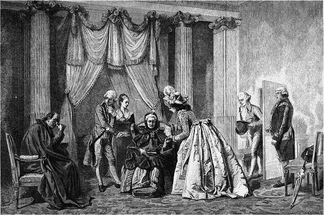 La vieille tante reçoit tous ces hommages d'une figure maussade et désagréable; on sent qu'elle en connaît la valeur. Mais la philosophie du tableau est tout entière dans la physionomie du domestique, dont le regard impassible embrasse toute la scène, et dans celle d'un abbé, familier de la maison, qui prend tranquillement sa prise de tabac; sans doute il connaît mieux que personne les dispositions du testament, et il a de bonnes raisons pour ne pas s'inquiéter et laisser tous ces avides parents faire leur cour aux écus de la douairière.