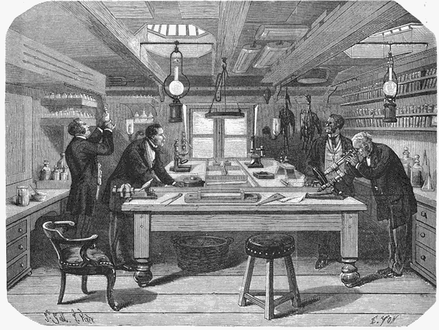 Le lecteur voit à main droite une bibliothèque peu nombreuse, mais renfermant tous les ouvrages techniques de nature à aider les expérimentateurs. En face se trouvent des piles voltaïques construites avec soin, et maintenues dans un parfait état d'entretien. Au-dessus des piles sont rangés les hameçons et les lances dont on fera usage pour capturer les géants des mers. Déjà on a saisi des oiseaux qui se sont imprudemment approchés du Challenger, et qui paient leur curiosité en servant à assouvir celle de leurs vainqueurs. Sur la table se trouvent les loupes, les microscopes droits, les microscopes obliques et même les microscopes binoculaires.