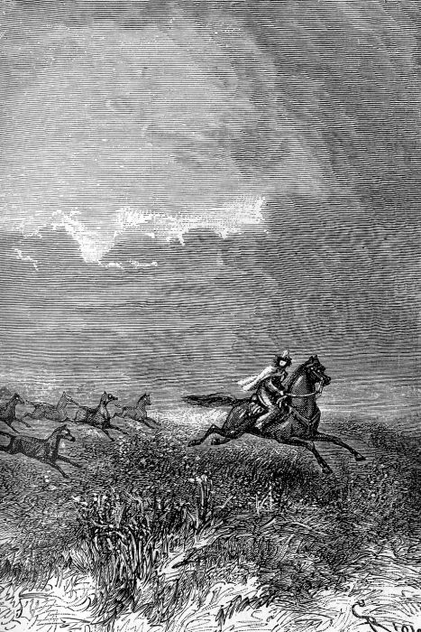 In the midst of these terrific gusts, Glenarvan, the major, and the captain bore the body of Mulready. The animal reared. Mulready seized his revolver and fired.—p. 420.