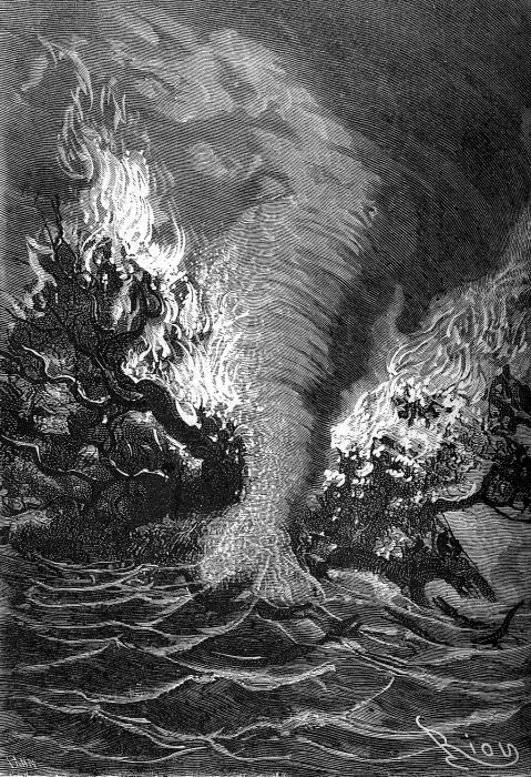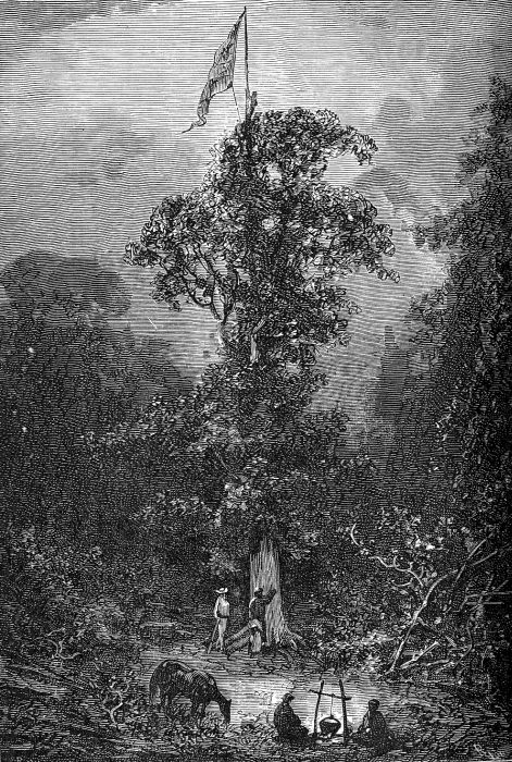 At evening they encamped at the foot of some trees that bore the marks of a recent fire. They formed tall chimneys, as it were, for the flames had hollowed them out internally throughout their entire length.—p. 353.