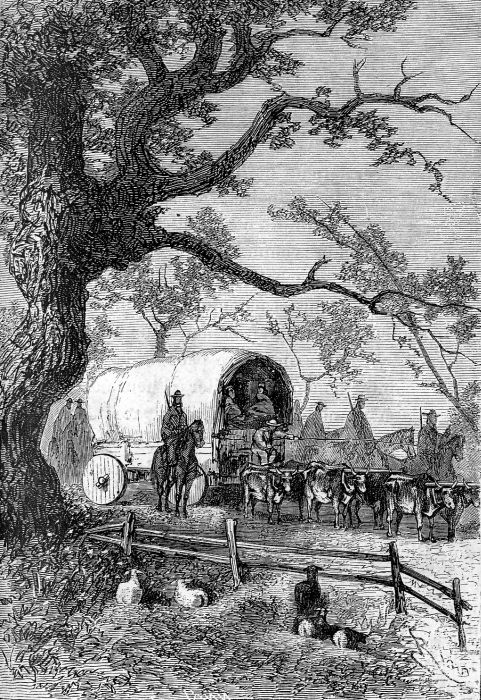 The vehicle was a cart twenty feet long and covered with an awning, the whole resting upon four wheels, without spokes, felloes, or tires.—p. 308.