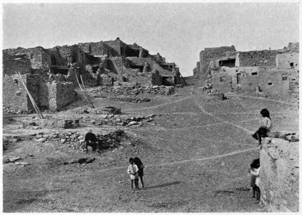 The term pueblo, a Spanish word meaning town, is by long and continued use now almost confined to the clusters of stone and adobe houses which to-day shelter the sedentary Indians of New Mexico and Arizona. Not only are these Indian towns called "pueblos," but we speak of the Indians themselves as the Pueblo Indians, and of the culture of the people—for they all have much in common—as the pueblo culture. This similarity of culture is not due to[Pg 734] unity of race or of language, but is the resultant of a peculiar environment. In recent times, the limits of the pueblo-culture area have contracted to meet the demands of the white man; we know also that before the advent of the Spaniard many once populous districts had been abandoned, and as a result there came to be fewer but larger villages. We know also, both from tradition and from archæological evidence, that in former days the pueblo people inhabited many of the villages of southern Colorado and Utah, and that the Hopis and their kin were numerous in many parts of Arizona. The silent houses of the cliffs, the ruins of central Arizona, and the great crumbling masses of adobe of the Salt and Gila River valleys and in northern Chihuahua are all former habitations of the Pueblo Indian. To-day there are no representatives of these people in Utah or Colorado, while the seven Hopi towns of Tusayan alone remain in Arizona. But there are still many pueblos scattered along the Rio Grande, Jemez, and San Juan Rivers in New Mexico. Alike in culture, we may divide the existing pueblos into four linguistic groups—namely, the Hopis of Arizona, the Zuñis of New Mexico, the Tehuas east of the Rio Grande, and the Queres to the west of the Rio Grande. Of the earlier home of the last three stocks we know but little. The ancestors of the Hopis we know came from different directions—some from the cliff dwellings of the north, others from central Arizona. To-day, however, they form a congeries of clans united and welded into a unit by similarity of purpose and by the more powerful influence of a peculiar environment.