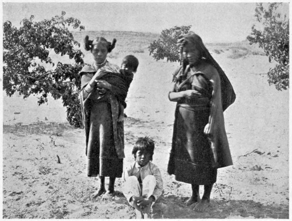 In nothing is the primitiveness or the absence from contamination of the Hopi better revealed than in the children, for here, as elsewhere, is it shown that they are the best conservators of the[Pg 740] habits and customs of ancestral life. What utter savages the little fellows are! Stark naked generally, whether it be summer or winter, dirty from head to foot, their long black hair disheveled and tangled and standing out in every direction, their head often resembling a thick matted bunch of sagebrush. They are never idle; now back of the village behind tiny stone ramparts eagerly watching their horsehair bird snares, or engaged in a sham battle with slings and corncobs, or grouped in threes or fours about a watermelon, eagerly and with much noise gorging themselves to absolute fullness, or down on the side of the mesa playing in the clay pits. A not uncommon sight is that of two or three little fellows trudging off in pursuit of imaginary game, armed with miniature bows and arrows or with boomerangs and digging-sticks. In their disposition toward white visitors they are extremely shy and reticent, but they are also very inquisitive and curious, and, furthermore, they have a sweet tooth, and one only need display a stick of candy to have half the infantile population of the pueblo at his heels for an hour at a time. If perchance one of the little fellows should die, he is not buried in the common cemetery at the foot of the mesa, but he is laid away among the rocks in some one of the innumerable crevices which are to be found on all sides near the top of the mesa, for the Hopis, in common with many other native tribes of America, believe that the souls of departed children do not journey to the spirit land, but are born again.