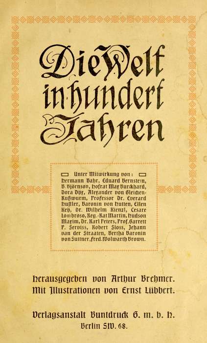 Unter Mitwirkung von: Hermann Bahr, Eduard Bernstein, B. Björnson, Hofrat Max Burckhard, Dora Dyx, Alexander von Gleichen-Rußwurm, Professor Dr. Everard Hustler, Baronin von Hutten, Ellen Key, Dr. Wilhelm Kienzl, Cesare Lombroso, Reg.-Rat Martin, Hudson Maxim, Dr. Karl Peters, Prof. Garrett P. Serviss, Robert Sloss, Jehan van der Straaten, Bertha Baronin von Suttner, Fred. Walworth Brown.