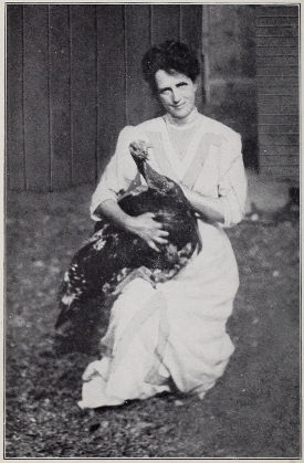 Miss Mahaney was a wonderfully capable trained nurse who broke down at her work and was ordered to the country to save her life, urged particularly to take up some out-of-door work. Poultry keeping appealed to her from the first, but turkeys particularly for the reason of the difficulties to be surmounted. If she could do what others could not she would be satisfied. Anyone could raise chickens, but hardly anyone could raise turkeys. Here was a task that delighted her and a problem that appealed to her. The difficulties she encountered would have discouraged any one but a pioneer of her character. Her deep maternal instinct (and she is, figuratively speaking, mother to everything and everybody upon the beautiful estate where she lives) brought the babies and old turkeys through their blackhead troubles, and from her medical training, together with the aid she received from contact with members of her family who were physicians, she recognized symptoms and remedies which one could acknowledge as miracles and not overstep the truth. She has applied the fruits of her life work to the solving of a problem, and some day the country at large from Maine to California will raise its hat to Margaret Mahaney, the lady from Concord, Mass., who restored what was supposed to be lost:—the art of raising turkeys,—and that in confinement in poultry houses under practically the same conditions as chickens.