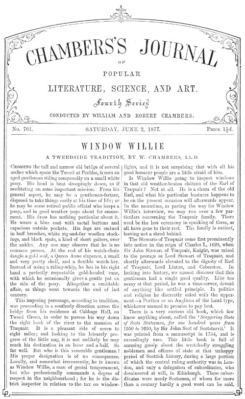 This imposing personage, according to tradition, was proceeding in a southerly direction across the bridge from his residence at Cabbage Hall, on Tweed Green, in order to pursue his way down the right bank of the river to the mansion of Traquair. It is a pleasant ride of seven to eight miles; and looking to the leisurely progress of the little nag, it is not unlikely he may reach his destination in an hour and a half. So far well. But who is this venerable gentleman? His proper designation is of no consequence. Locally, and somewhat irreverently, he is known as Window Willie, a man of genial temperament, but who professionally commands a degree of respect in the neighbourhood; for he is the district inspector in relation to the tax on window-lights, and it is not surprising that with all his good humour people are a little afraid of him.