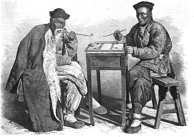 Le Chinois est joueur. Le jeu est, en Chine, une passion commune à toutes les classes de la société. Du plus petit au plus grand, tout le monde joue. On rencontre dans les rues de Pékin une foule de petits tripots ambulants, où l'ouvrier ne perd que trop souvent le soir le fruit de son travail de la journée. Les marchands, les gens riches se réunissent, pour jouer, dans les maisons de thé, qui sont, dans le Céleste-Empire, ce que sont chez nous les cafés.