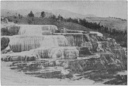 All the natural scenery in the park is carefully guarded and is now as it was when first discovered. But millions of dollars have been expended in a mechanical way to improve the park. The drive that begins at the railway depot is 150 miles in length and is stocked with elegant stage coaches and cabs made especially for the mountain roads. Hundreds of horses are constantly at work during the summer season conveying the thousands of people from all over the world to and fro from one hot spring and geyser to another. There are hotel accommodations for a thousand people. The Mammoth Hot Springs Hotel, which is located at Mammoth Hot Springs, is a very large one. At other points hotels and lunch stations are maintained through the park season. These hotels are heated by steam, lighted by electricity, and supplied with bath rooms, and in one case—the Fountain Hotel—with water from one of the hot springs. There is also telegraph communication from this place in the heart of the Rockies with all the civilized world.